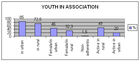 Youth rights At the top of what they think is their rights there is the right to heritage of their parents’ property (19%); this shows not only Rwandans’ attachment to land but also some sense of insecurity for the future. The right to professional training comes second (15%) which highlights the importance they attach to qualification for the future. The youth have confidence in the judicial system, which could be the result of good governance and Gacaca jurisdictions in relation to genocide trials. The right to live in a secure environment is also important, showing the youth’s aspirations for political stability. Youth in associations The analysis study based on questionnaires provided, and interviews with relevant personality, shows that 85% of youth in Rwanda are members of youth association. The percentage of females is of 46%, male 54%. But youth active members within association are only 20%, while the number of non-adherent youth to any association is about 1,5%. The period of being active in association for youth is between 12 month-8 years for those who joined the association at the age between 14-18 years, while the period of being active in association to another category of youth is between 12 months- 5 years.